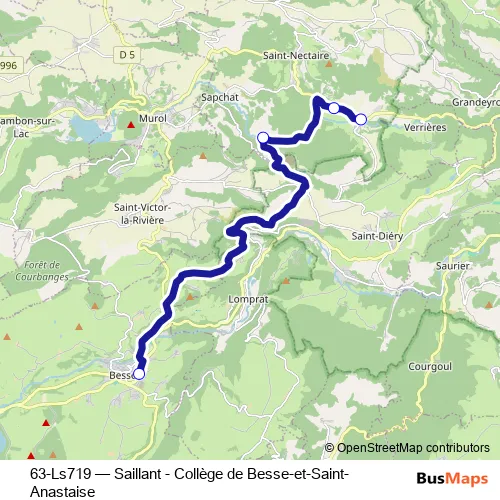 The first stop of the 63-Ls719 bus route is Collège Besse and the last stop is Saillant. 63-Ls719 (Saillant - Collège de Besse-et-Saint-Anastaise) is operational during en semaine.