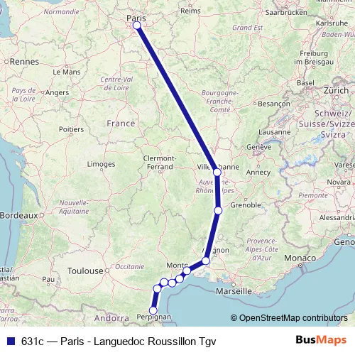 The first stop of the 631c rail route is Perpignan and the last stop is Paris Gare de Lyon Hall 1 - 2. 631c (Paris - Languedoc Roussillon Tgv) is operational during tous les jours.