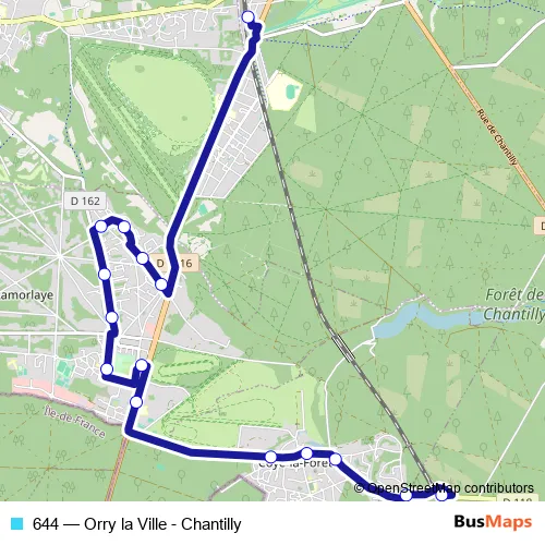 The first stop of the 644 bus route is Orry LA Ville - Gare Sncf and the last stop is Chantilly - Gare. 644 (Orry la Ville - Chantilly) is operational during tous les jours.