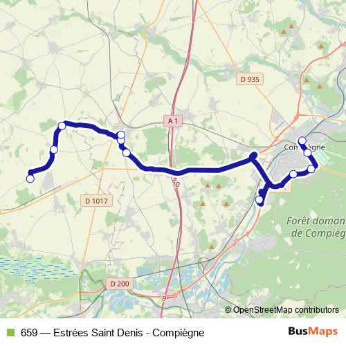 The first stop of the 659 bus route is Compiegne - Gare-Quai de la République and the last stop is Epineuse - Centre. 659 (Estrées Saint Denis - Compiègne) is operational during tous les jours.