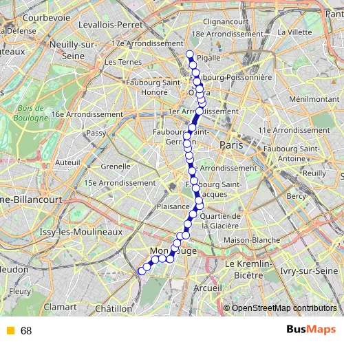 The first stop of the 68 bus route is Châtillon - Montrouge - Métro and the last stop is Place de Clichy. 68 is operational during tous les jours.