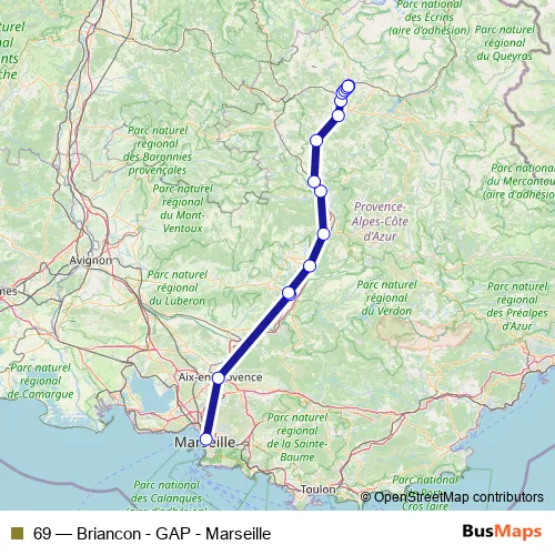 The first stop of the 69 bus route is Gare Routière St Charles and the last stop is Gare Routière. 69 (Briancon - GAP - Marseille) is operational during tous les jours.