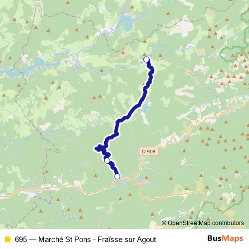 The first stop of the 695 bus route is Fraisse-SUR-Agout - Centre and the last stop is Saint-Pons-DE-Thomieres - Foirail. 695 (Marché St Pons - Fraïsse sur Agout) is operational during tous les jours.