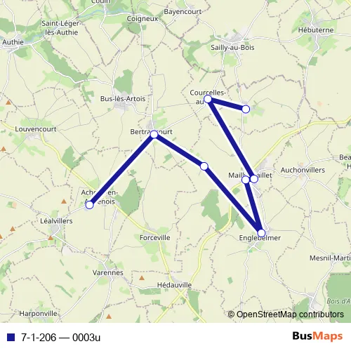 The first stop of the 7-1-206 bus route is Acheux-EN-Amienois - Collège Edmée Jarlaud and the last stop is Colincamps - Centre. 7-1-206 (0003u) is operational during tous les jours.
