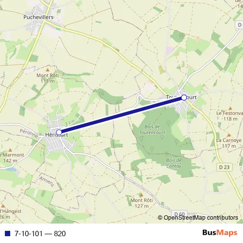 The first stop of the 7-10-101 bus route is Toutencourt - Centre and the last stop is Toutencourt - Centre. 7-10-101 (820) is operational during tous les jours.
