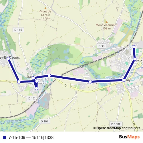 The first stop of the 7-15-109 bus route is Bussy-LES-Daours - Mairie and the last stop is Corbie - Collège Eugène Lefebvre. 7-15-109 (1511h|1338) is operational during en semaine.