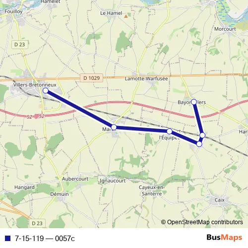 The first stop of the 7-15-119 bus route is Bayonvillers - Centre and the last stop is Villers-Bretonneux - Collège Jacques Brel. 7-15-119 (0057c) is operational during tous les jours.