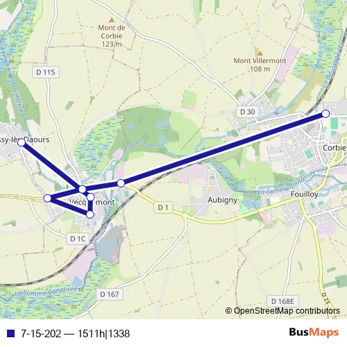 The first stop of the 7-15-202 bus route is Corbie - Collège Eugène Lefebvre and the last stop is Bussy-LES-Daours - Mairie. 7-15-202 (1511h|1338) is operational during tous les jours.