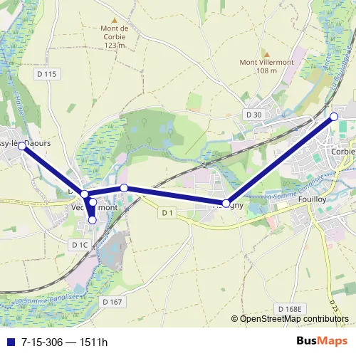 The first stop of the 7-15-306 bus route is Corbie - Collège Eugène Lefebvre and the last stop is Bussy-LES-Daours - Mairie. 7-15-306 (1511h) is operational during tous les jours.