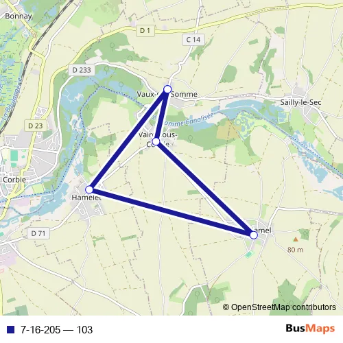 The first stop of the 7-16-205 bus route is Vaux-SUR-Somme - Centre and the last stop is Vaux-SUR-Somme - Centre. 7-16-205 (103) is operational during tous les jours.