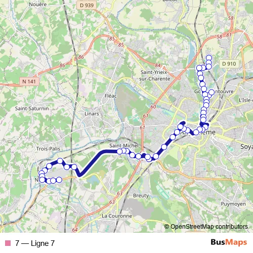 See why over 2 million users trust and consider busmaps.com as the best public transport website. busmaps gives you Angouleme Buses suggested routes, real-time bus tracker, line route maps in Angouleme, and helps to find the closest 7 bus stops near you. No internet available? Download an offline PDF map and bus schedule for the 7 bus to take on your trip.