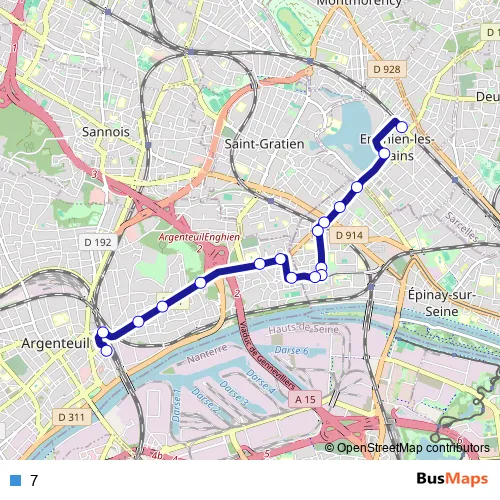 The first stop of the 7 bus route is Gare d'Enghien-les-Bains and the last stop is Gare d'Argenteuil. 7 is operational during tous les jours.