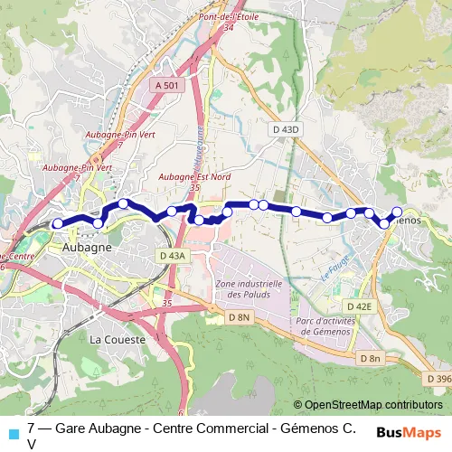 Gemenos Centre Ville. 7 (Gare Aubagne - Centre Commercial - Gémenos C.V) is operational during tous les jours.
