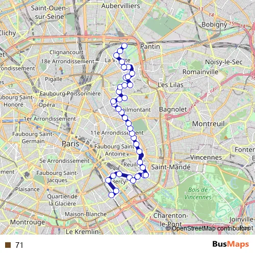 See why over 2 million users trust and consider busmaps.com as the best public transport website. busmaps gives you Paris Buses suggested routes, real-time bus tracker, line route maps in Paris, and helps to find the closest 71 bus stops near you. No internet available? Download an offline PDF map and bus schedule for the 71 bus to take on your trip.