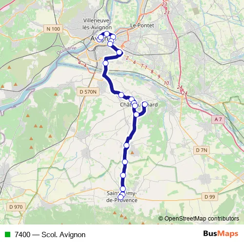 The first stop of the 7400 bus route is Saint Dominique/Mistral and the last stop is République. 7400 (Scol. Avignon) is operational during en semaine.
