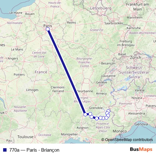 The first stop of the 770a rail route is Paris Austerlitz and the last stop is Briançon. 770a (Paris - Briançon) is operational during tous les jours.