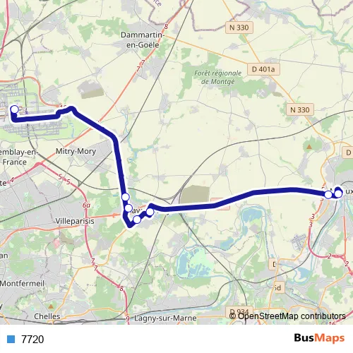 The first stop of the 7720 bus route is Gare de Meaux (Quai D) and the last stop is Gare de Roissypole - Aéroport Cdg1 Terminal 3 (C4). 7720 is operational during tous les jours.