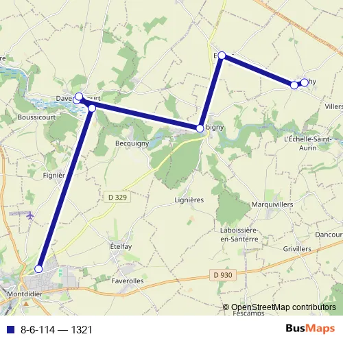 The first stop of the 8-6-114 bus route is Andechy - Rue de l'école and the last stop is Montdidier - Parking Collège et Lycée. 8-6-114 (1321) is operational during tous les jours.