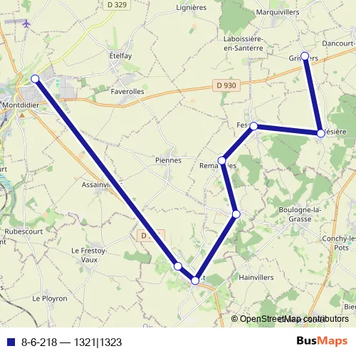 The first stop of the 8-6-218 bus route is Montdidier - Parking Collège et Lycée and the last stop is Grivillers - Place de l'Eglise. 8-6-218 (1321|1323) is operational during tous les jours.