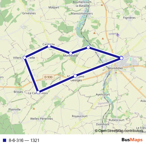 The first stop of the 8-6-316 bus route is Montdidier - Parking Collège et Lycée and the last stop is Montdidier - Parking Lycée (accompagnatrice). 8-6-316 (1321) is operational during tous les jours.