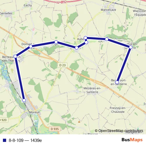 The first stop of the 8-8-109 bus route is Beaucourt-EN-Santerre - Grande Rue and the last stop is Moreuil - Collège Jean Moulin. 8-8-109 (1439e) is operational during tous les jours.