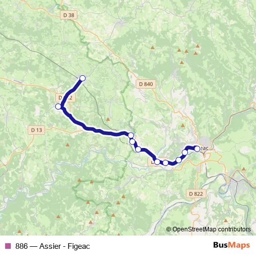 The first stop of the 886 bus route is Assier - Bourg and the last stop is Figeac - Gare Routière. 886 (Assier - Figeac) is operational during en semaine.