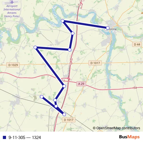 The first stop of the 9-11-305 bus route is Peronne - Collège Béranger and the last stop is Lihons - Place. 9-11-305 (1324) is operational during tous les jours.