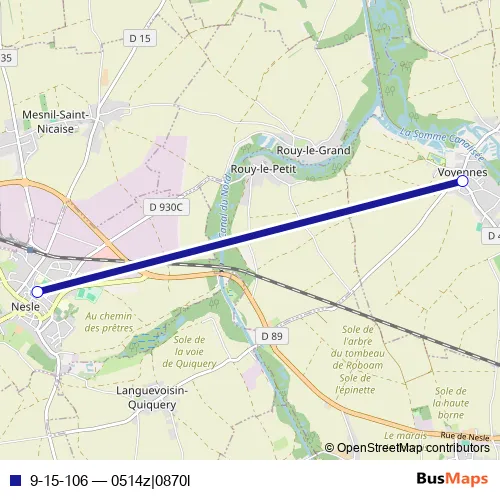 The first stop of the 9-15-106 bus route is Voyennes - Ecole and the last stop is Nesle - Groupe scolaire. 9-15-106 (0514z|0870l) is operational during tous les jours.