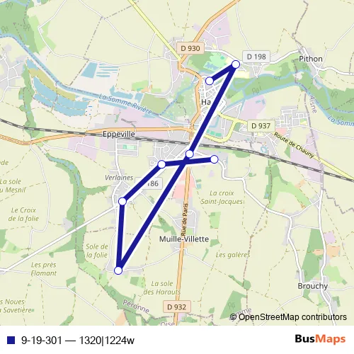 The first stop of the 9-19-301 bus route is HAM - Collège Notre Dame and the last stop is Muille-Villette - Flamicourt. 9-19-301 (1320|1224w) is operational during tous les jours.