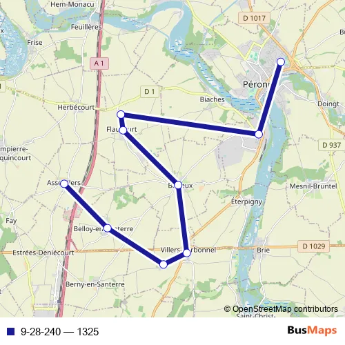 The first stop of the 9-28-240 bus route is Peronne - Lycée P. M. France and the last stop is Assevillers - Eglise. 9-28-240 (1325) is operational during tous les jours.