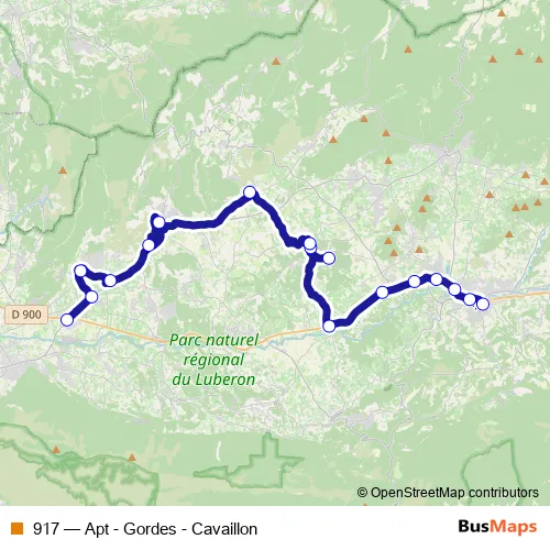 The first stop of the 917 bus route is Gare Routière and the last stop is Coustellet Pl du Marché (L17/18). 917 (Apt - Gordes - Cavaillon) is operational during tous les jours.