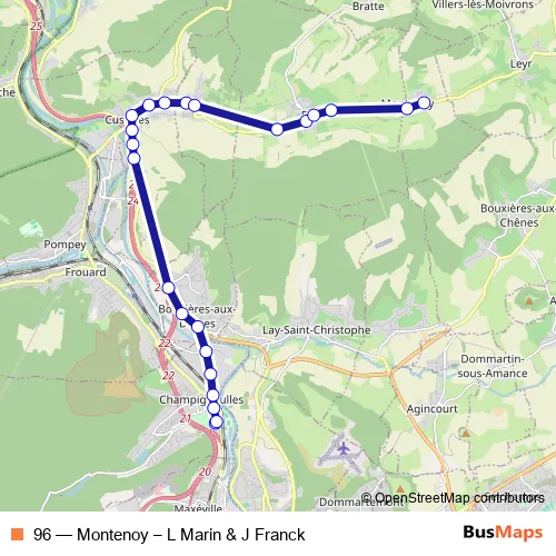 The first stop of the 96 bus route is College de Champigneulles and the last stop is Petit Verger. 96 (Montenoy – L Marin & J Franck) is operational during en semaine.