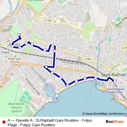 The first stop of the A bus route is Saint-Raphaël Gare Routière (Quai A) and the last stop is Fréjus Gare Routière (Quai 1-A). A (Navette A : St-Raphaël Gare Routière - Fréjus Plage - Fréjus Gare Routière) is operational during tous les jours.