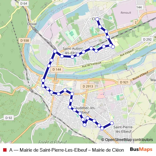The first stop of the A bus route is Mairie DE ST Pierre and the last stop is Mairie DE Cleon. A (Mairie de Saint-Pierre-Les-Elbeuf – Mairie de Cléon) is operational during tous les jours.