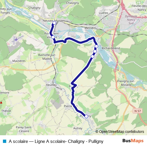 The first stop of the A scolaire bus route is Neuves-Maisons - Pont Sncf and the last stop is Pulligny - Foyer Culturel. A scolaire (Ligne A scolaire- Chaligny - Pulligny) is operational during en semaine.