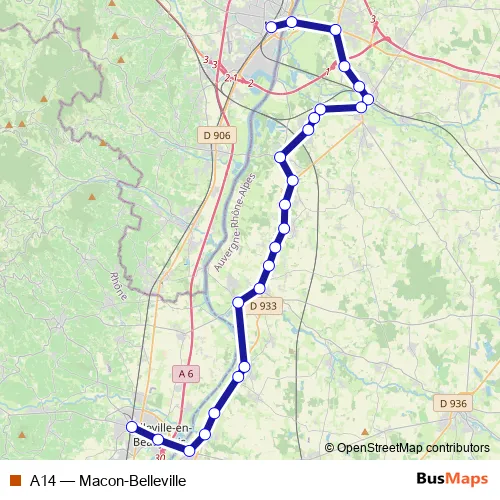 The first stop of the A14 bus route is Gare Routière and the last stop is Gare Sncf. A14 (Macon-Belleville) is operational during tous les jours.