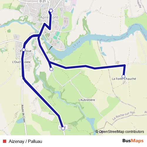 The first stop of the Aizenay / Palluau bus route is La Forêt Chauché and the last stop is Rue des 18 Otages N° 5. Aizenay / Palluau (Aizenay / Palluau) is operational during en semaine.