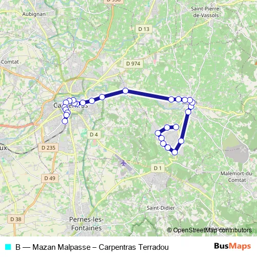 The first stop of the B bus route is Mazan Malpasse1 and the last stop is Carpentras Terradou Arrivee1. B (Mazan Malpasse – Carpentras Terradou) is operational during tous les jours.
