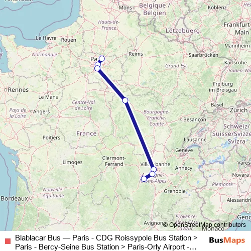 Bus Blablacar Bus - Paris - CDG Roissypole Bus Station > Paris - Bercy-Seine Bus Station > Paris-Orly Airport - Orly Parking Cars de groupe 1 > Auxerre - Train Station > Lyon - Gerland Bus Station > Givors (Lyon Sud) > Saint-Étienne - Rue Milleret Bus Stop in Paris: Stops & Timetable