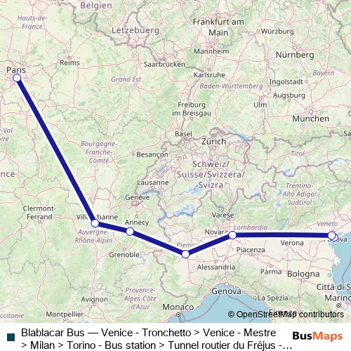Blablacar Bus (Venice - Tronchetto > Venice - Mestre > Milan > Torino - Bus station > Tunnel routier du Fréjus - Italie > Tunnel Routier du Fréjus - France > Chambéry > Lyon - Perrache Bus Station > Paris City Centre - Bercy Seine) Bus in Venice