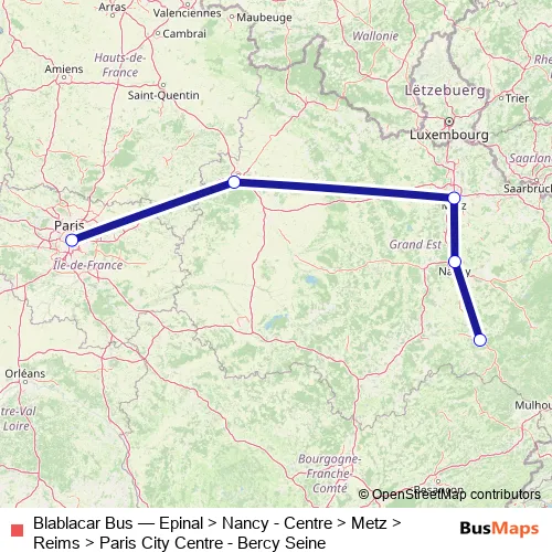 The first stop of the Blablacar Bus bus route is Epinal and the last stop is Paris - Bercy-Seine Bus Station. Blablacar Bus (Epinal > Nancy - Centre > Metz > Reims > Paris City Centre - Bercy Seine) is operational during tous les jours.