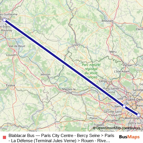 The first stop of the Blablacar Bus bus route is Paris - Bercy-Seine Bus Station and the last stop is Rouen - Avenue Champlain Bus Stop. Blablacar Bus (Paris City Centre - Bercy Seine > Paris - La Défense (Terminal Jules Verne) > Rouen - Rive gauche) is operational during tous les jours.