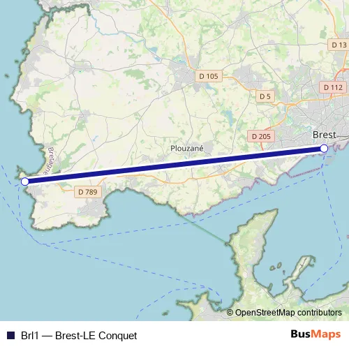 The first stop of the Brl1 ferry route is Gare maritime de Brest and the last stop is Gare maritime LE Conquet. Brl1 (Brest-LE Conquet) is operational during tous les jours.