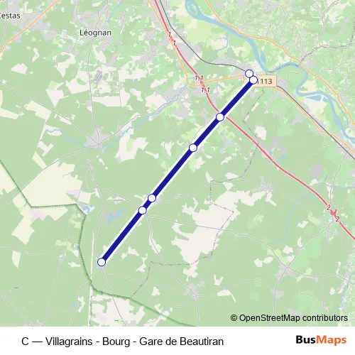 The first stop of the C bus route is Gare de Beautiran and the last stop is Villagrains - Bourg. C (Villagrains - Bourg - Gare de Beautiran) is operational during en semaine.