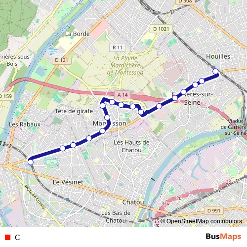 The first stop of the C bus route is Gare de Houilles - Carrières-sur-Seine and the last stop is Gare du Vésinet - Le Pecq. C is operational during tous les jours.