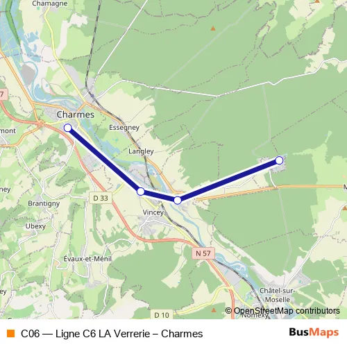 The first stop of the C06 bus route is Charmes College and the last stop is Portieux LA Verrerie. C06 (Ligne C6 LA Verrerie – Charmes) is operational during en semaine.