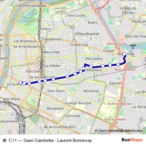 The first stop of the C11 trolleybus route is Laurent Bonnevay and the last stop is Saxe - Gambetta. C11 (Saxe Gambetta - Laurent Bonnevay) is operational during tous les jours.