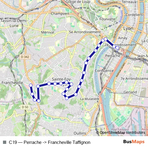 The first stop of the C19 bus route is Francheville Taffignon and the last stop is Perrache. C19 (Perrache -> Francheville Taffignon) is operational during tous les jours.