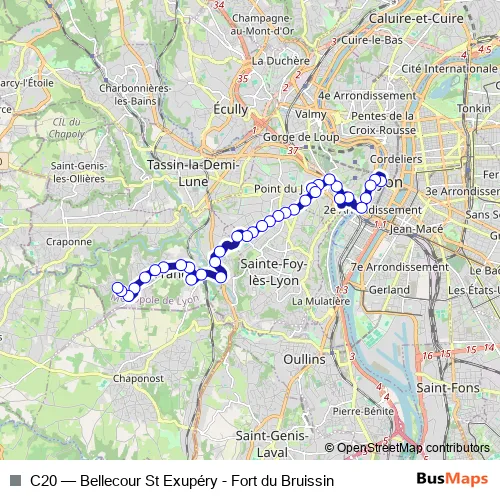 The first stop of the C20 trolleybus route is Bellecour St Exupéry and the last stop is Fort du Bruissin. C20 (Bellecour St Exupéry - Fort du Bruissin) is operational during tous les jours.