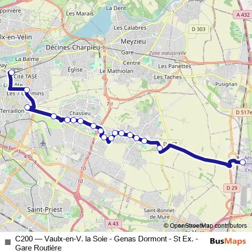 The first stop of the C200 trolleybus route is Vaulx-en-Velin La Soie and the last stop is Aéroport St Exupéry. C200 (Vaulx-en-V. la Soie - Genas Dormont - St Ex. - Gare Routière) is operational during tous les jours.